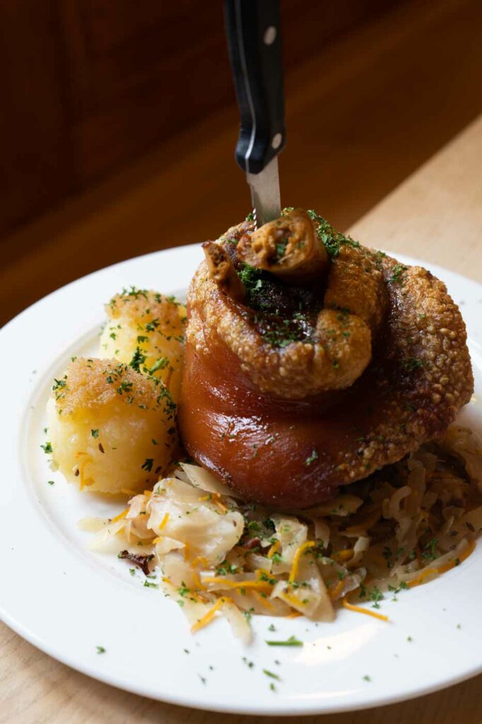 Dazu gibt’s herzhafte bayrische Schmankerl von unserer kleinen Festkarte: vom traditionellen Obazda mit einer frisch gebackenen Brezn, über deftige Brotzeit-Brettl, bis hin zu Schweinsbraten mit knuspriger Kruste, Knödeln und Sauerkraut oder natürlich unsere XXL-Schweinshaxe, ein gutes Kilo!